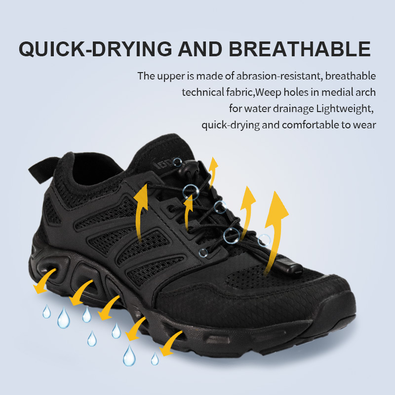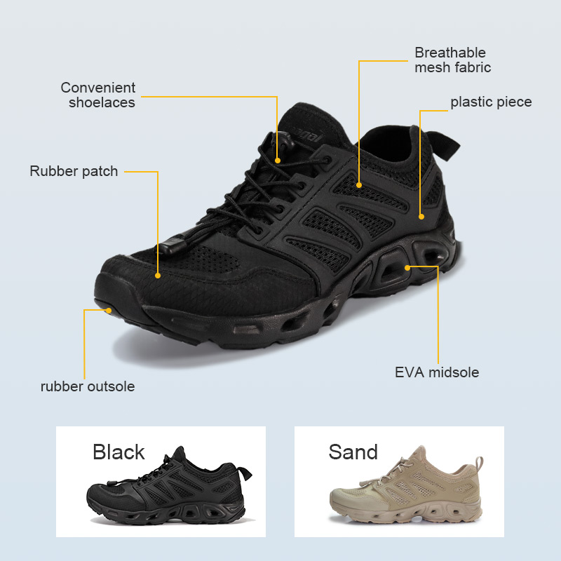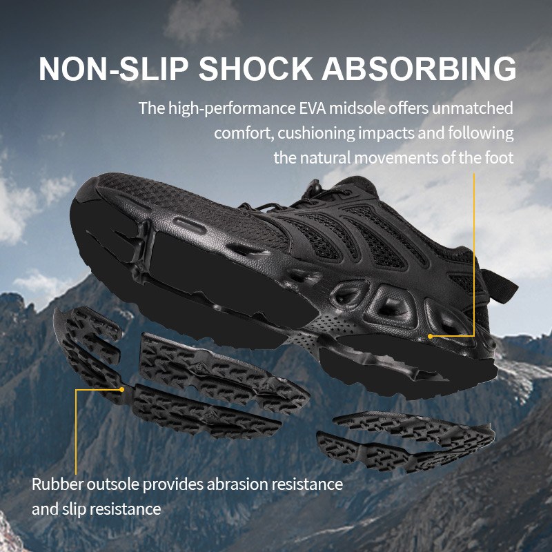 EVA Shock Absorbing Trekking Shoes er bygget for stien – våt eller tørr. Med hurtigtørkende materialer og dreneringsporter i buen, slipper den vann raskt når du går fra bekk til topp. En gummihællapp låser stabiliteten, mens EVA-mellomsålen gir myk, støtdempende komfort under foten. Og den robuste yttersålen i gummi? Bygget for å gripe omtrent alt – stein, gjørme, løs grus. Den er amfibisk, smidig og bygget for å bevege seg med deg.