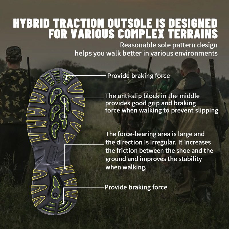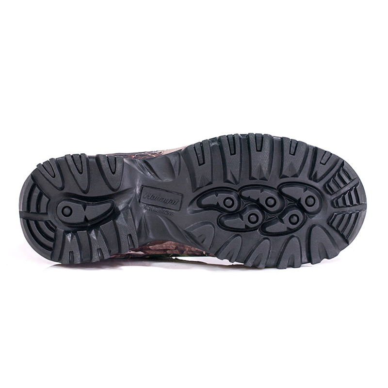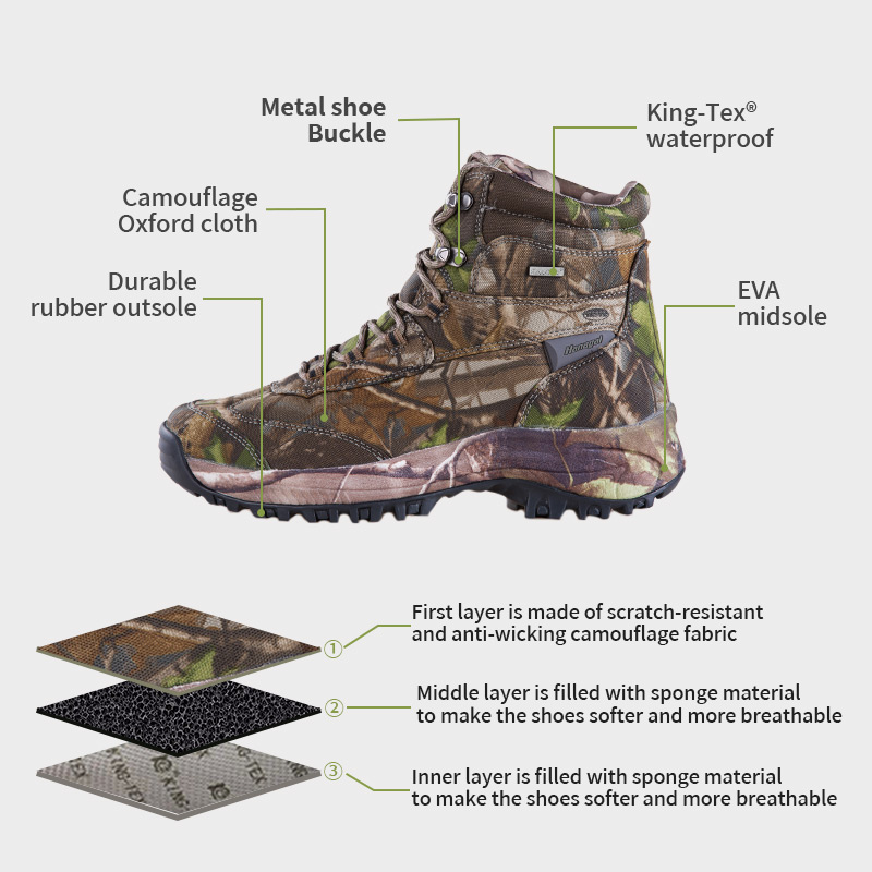 ①Poliyou høystrekk fukttransporterende innersåle holder interiøret tørt. ②EVA mellomsåle, pakket inn i kamuflasjeduk, demping og støtdemping. ③ Slitesterk yttersåle i gummi, sklisikker og slitesterk.