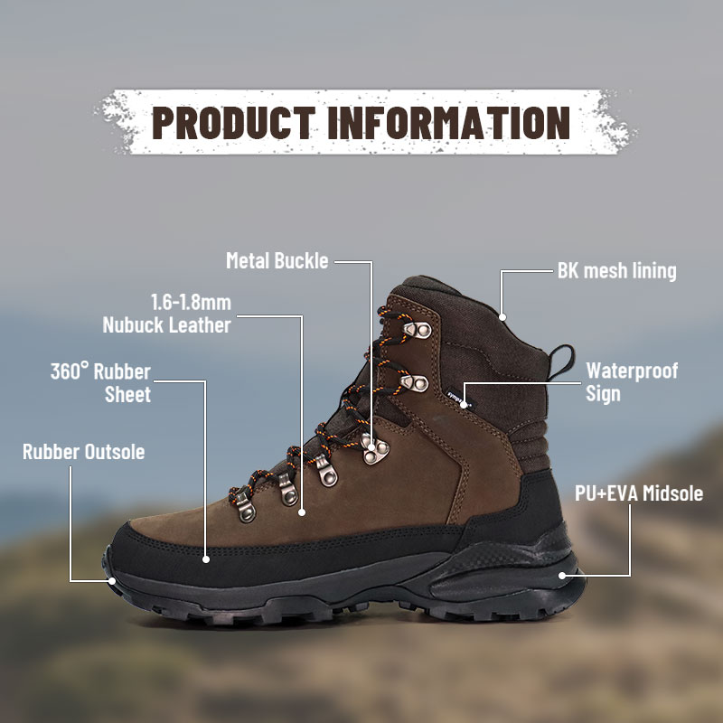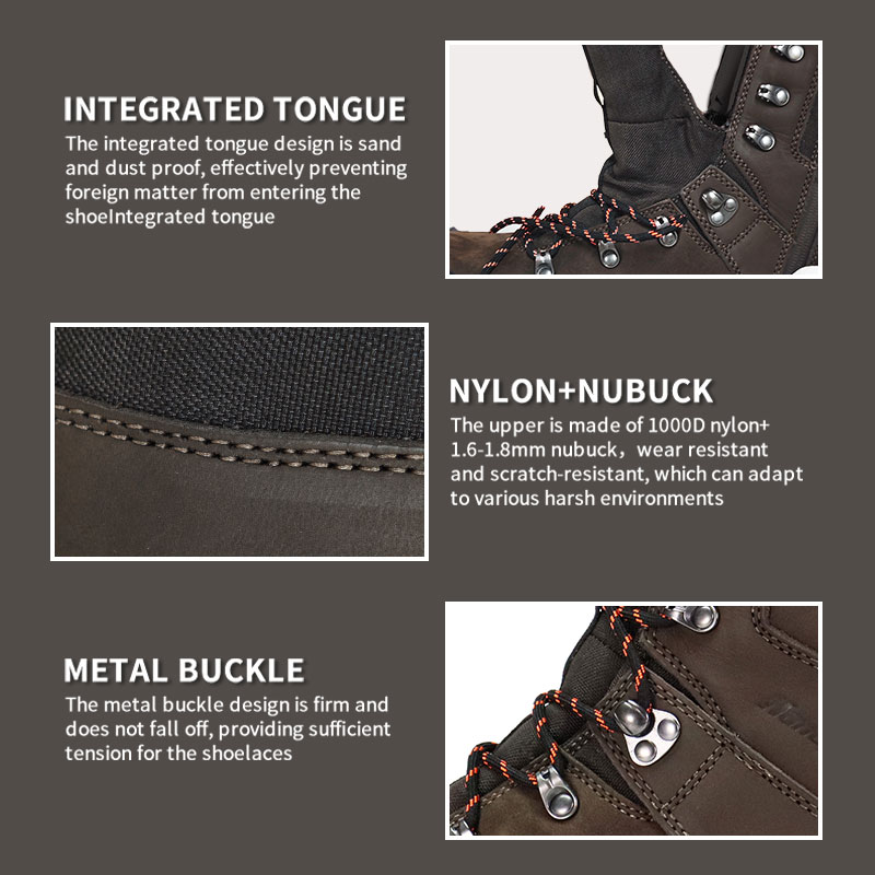 Tåen og hælen er forsterket, og gummiplater er festet rundt skokroppen for å gi allsidig beskyttelse for foten og holde foten trygg når du klatrer eller jakter.