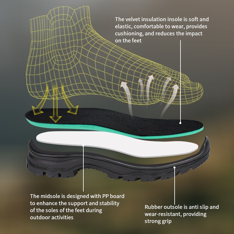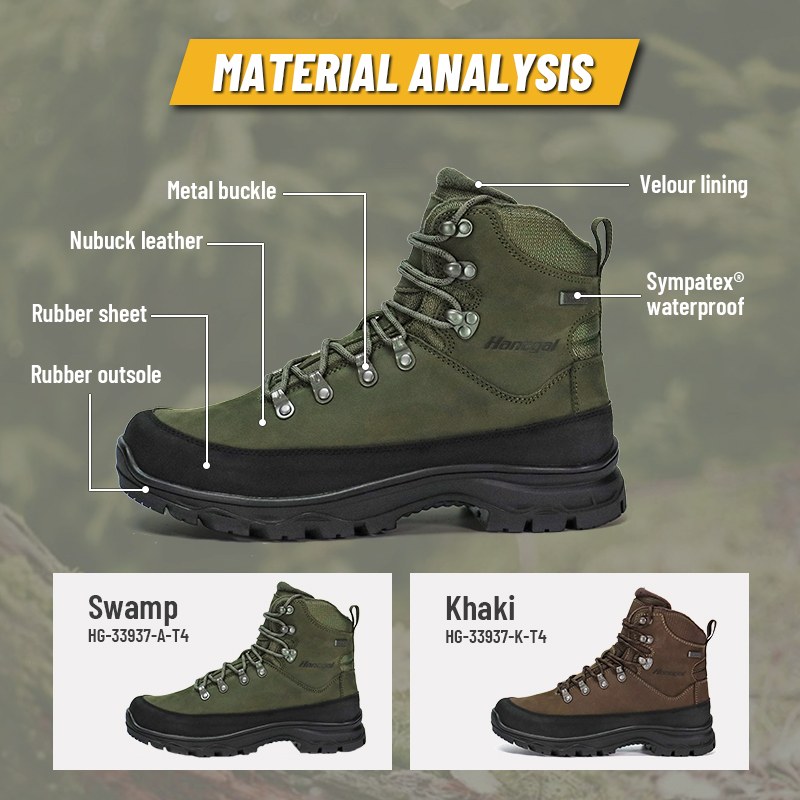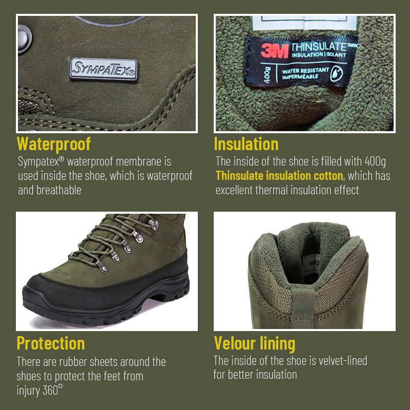 Disse Sympatex vanntette isolasjons Thinsulate jaktstøvlene er tilgjengelige for tilpasning i farger, materialer og detaljer, med MOQ på 800 par, ideelle for merkevaresamarbeid og gruppeanskaffelser. Og disse jaktstøvlene har følgende fordeler: