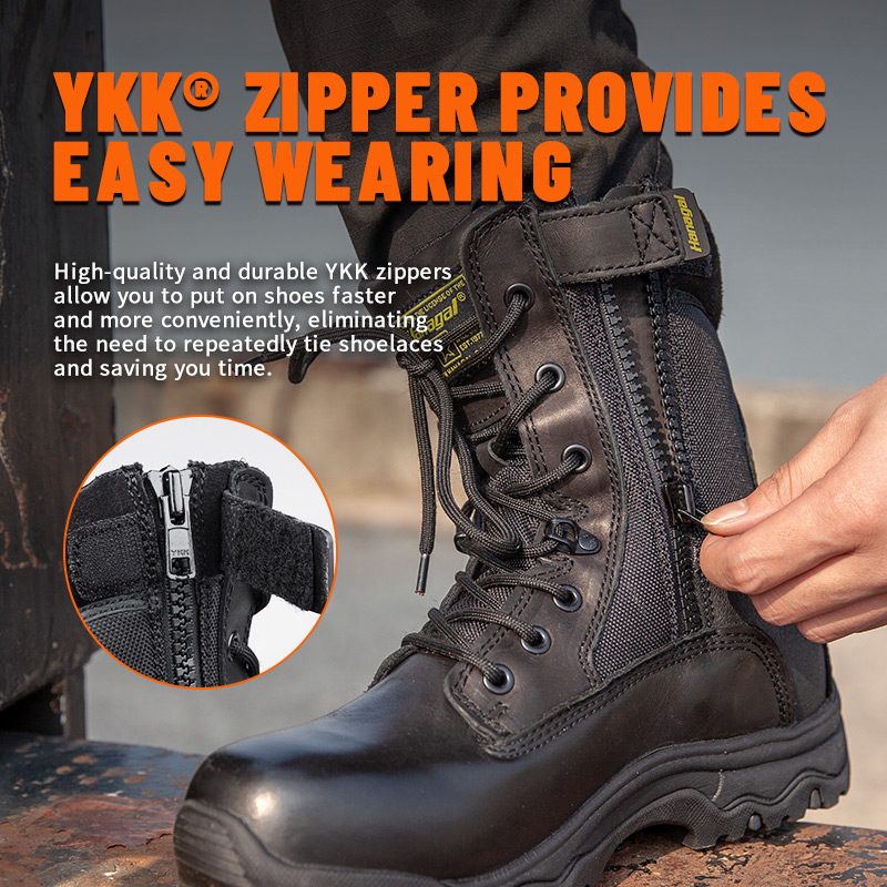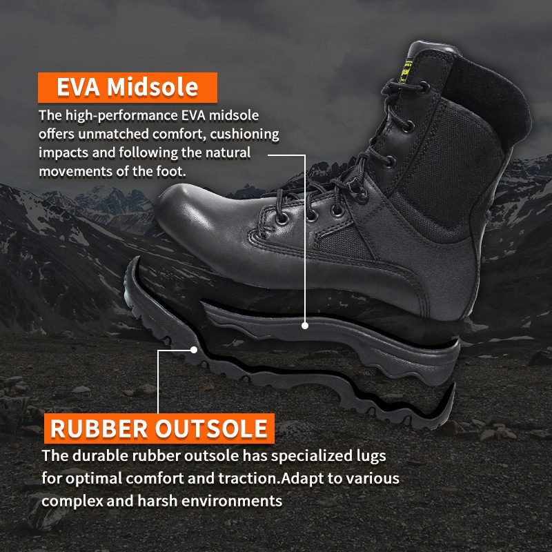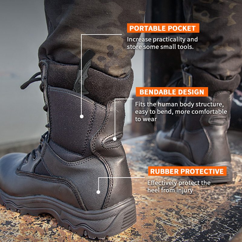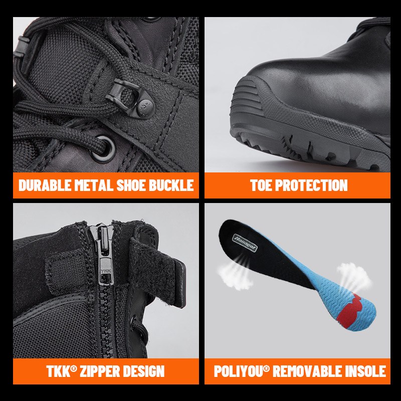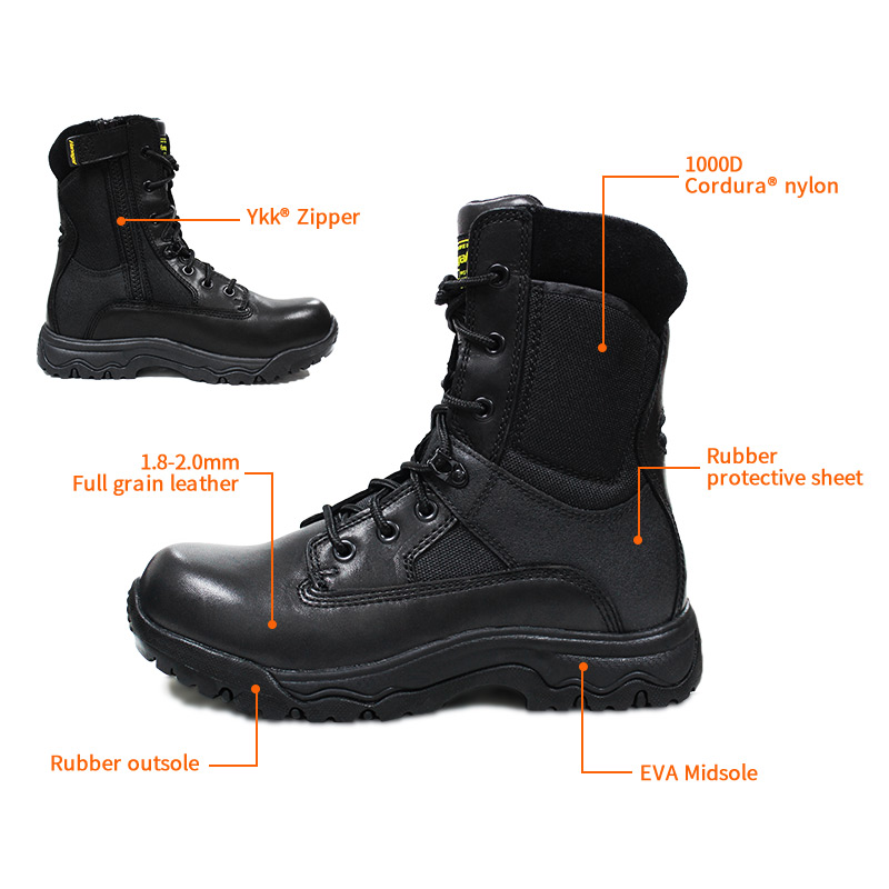 Disse politistøvlene i fullnarvet YKK-glidelås er tilgjengelige for tilpasning i farger, materialer og detaljer, med MOQ på 800 par, ideelle for merkesamarbeid og gruppeanskaffelser. Og disse jaktstøvlene har følgende fordeler: